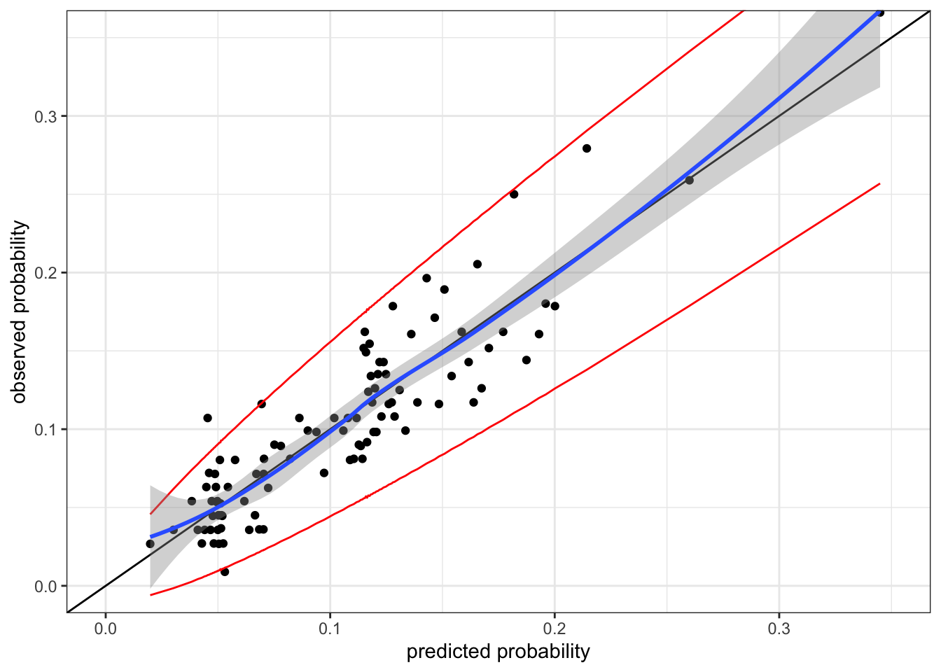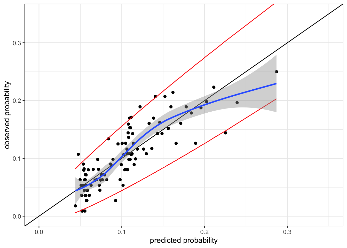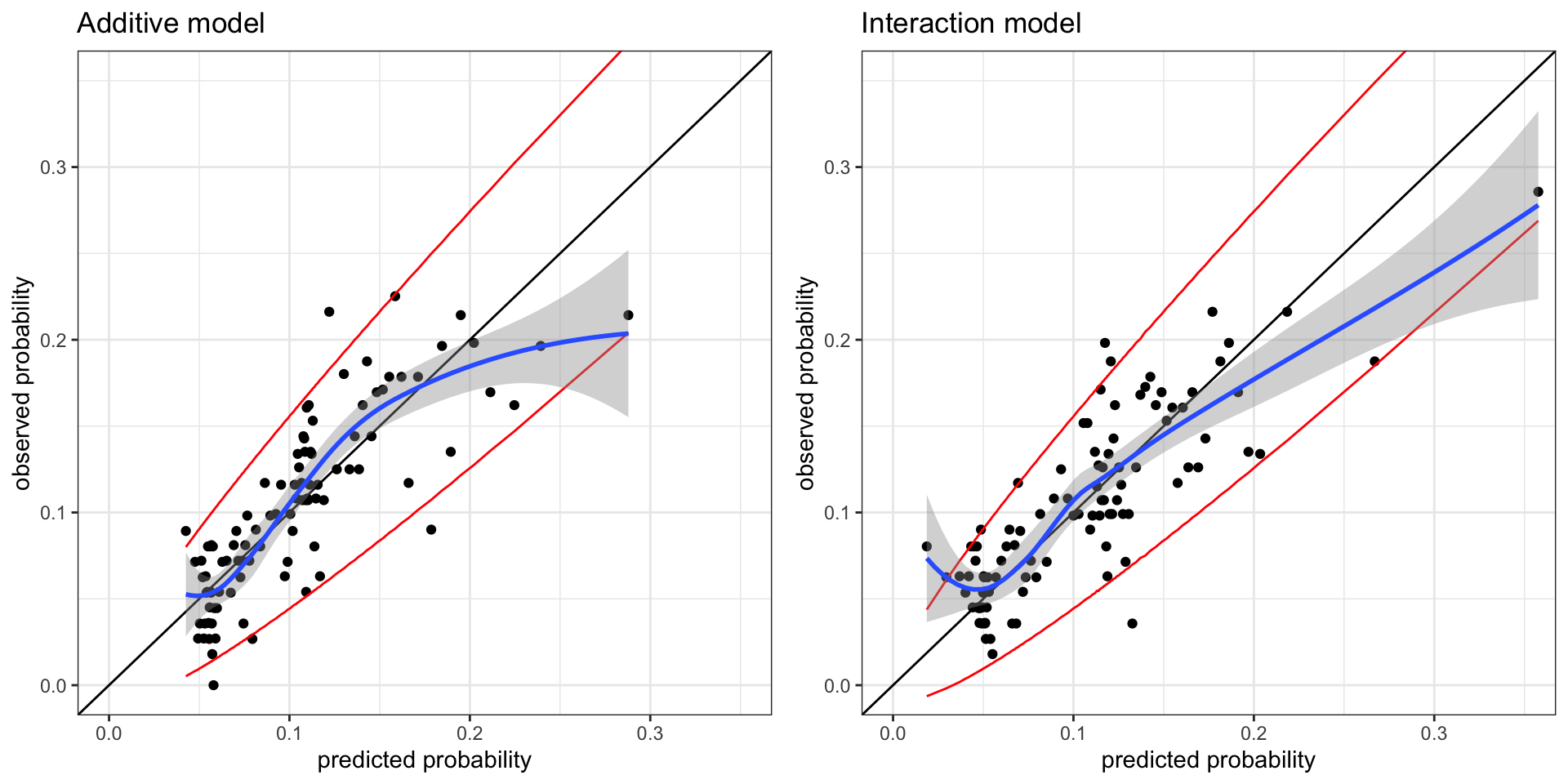 Figure 10.9 does not change our perspective on the calibration of the additive model (without interaction terms). The cross-validated calibration plot for that model resembles Figure 10.7. The cross-validated calibration plot for the interaction model in Figure 10.9 is, however, not as convincing as Figure 10.8. It seems that the interaction model underpredicts the small probabilities and overpredicts the large probabilities. There are random fluctuations in the plot due to the random splits in the cross-validation procedure, but repeated runs result in calibration plots with similar overall structure.