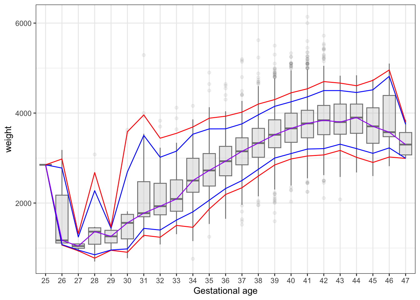 geom_line(data = weight_quant, aes(y = q50, group = 1), color = "purple") +