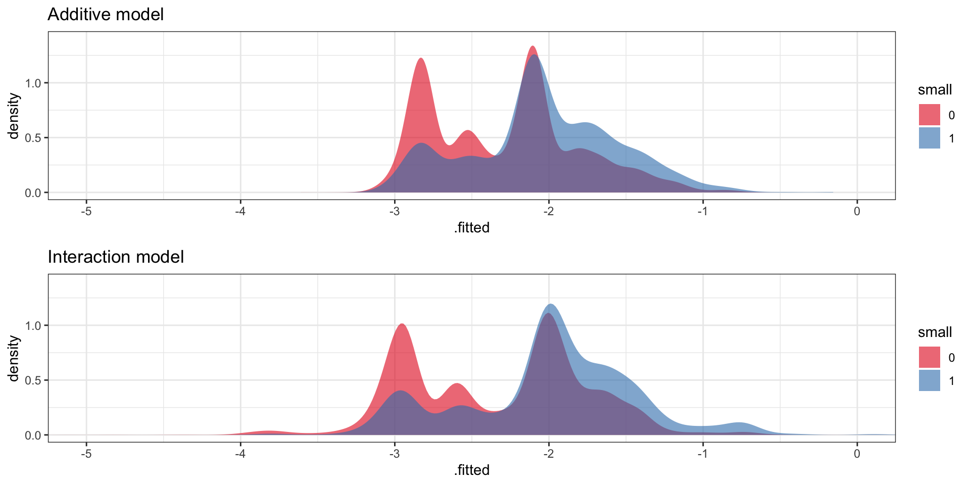 p1 ggplot(aes(.fitted, fill = factor(small))) +