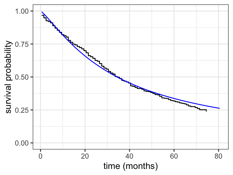 We might, of course, also be interested in prediction, which we often call survival prognosis. It is rarely of interest to make a point prediction of a survival time for an individual, but we might report a prediction interval (the interquartile range, say), or we might report probabilistic predictions in terms of an entire (conditional) survival distribution.