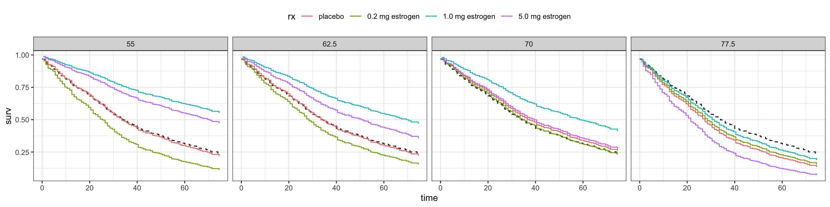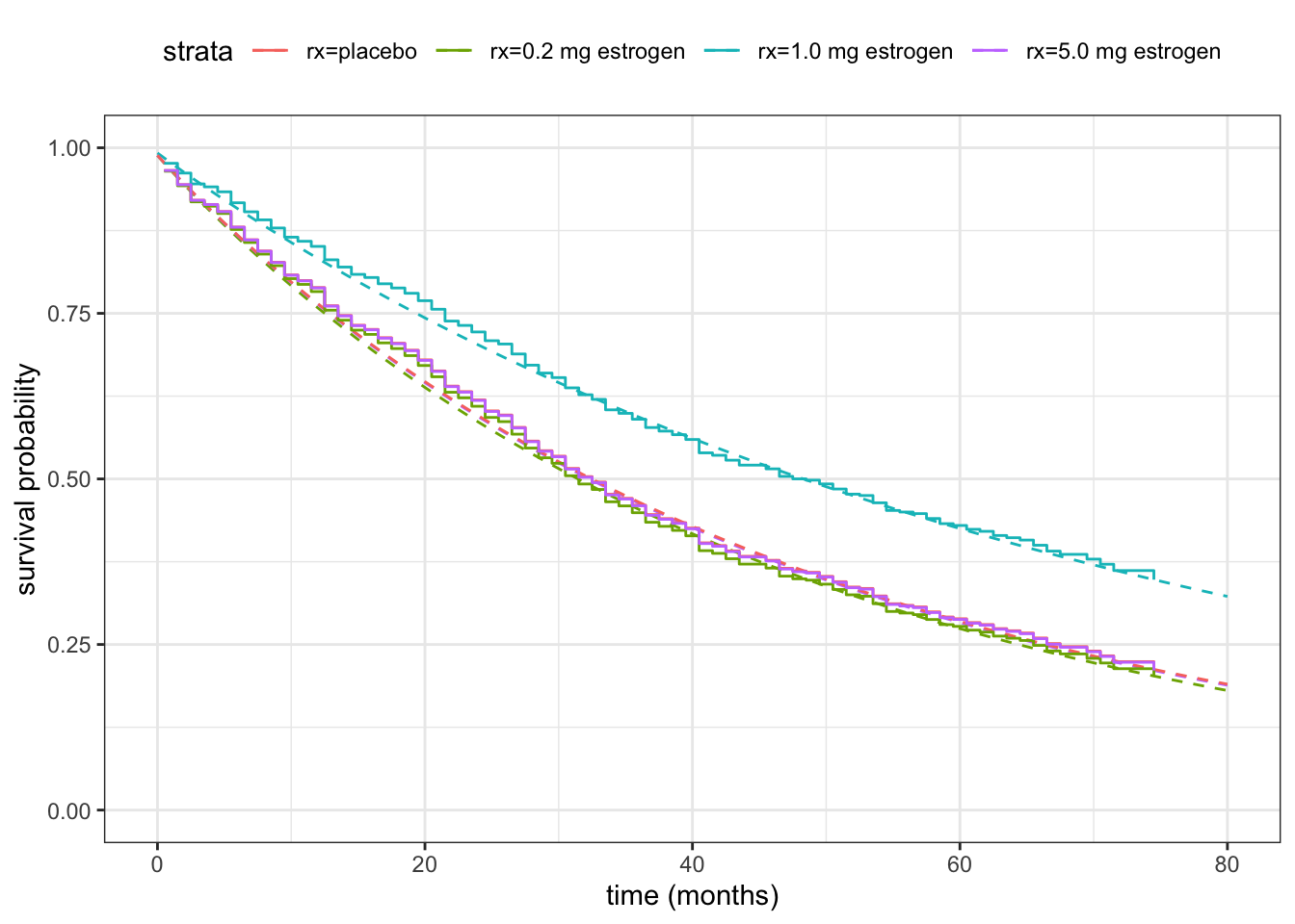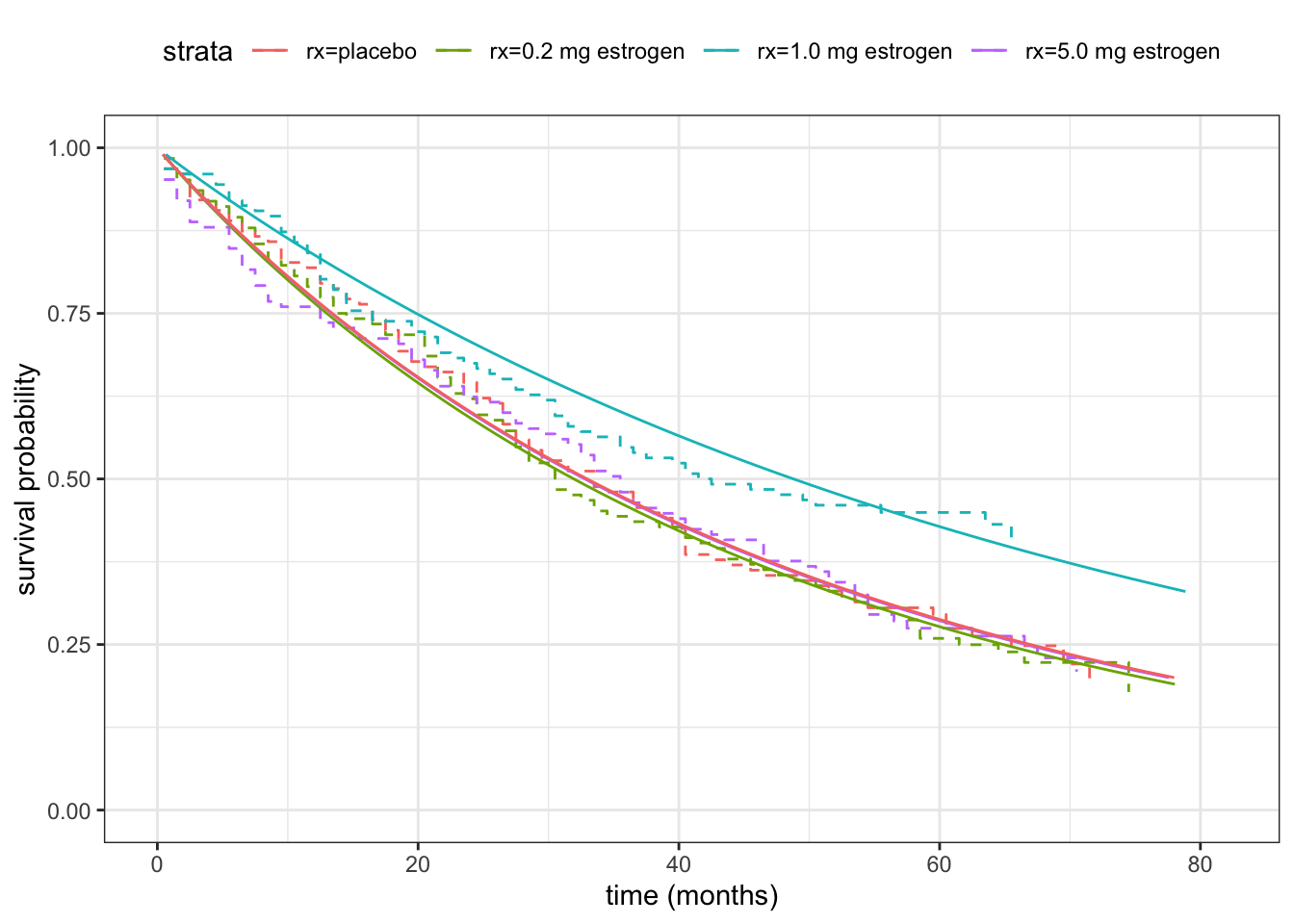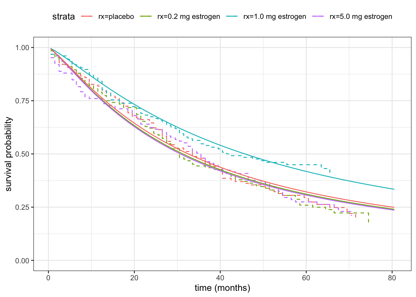 Since the treatments were randomly assigned, differences in the survival distributions between the four treatment groups can be ascribed to the treatment alone. That is, the treatments can be interpreted as the causes of any such differences. We will first of all be interested in testing if there are effects of treatment as well as estimating the magnitudes of such effects.