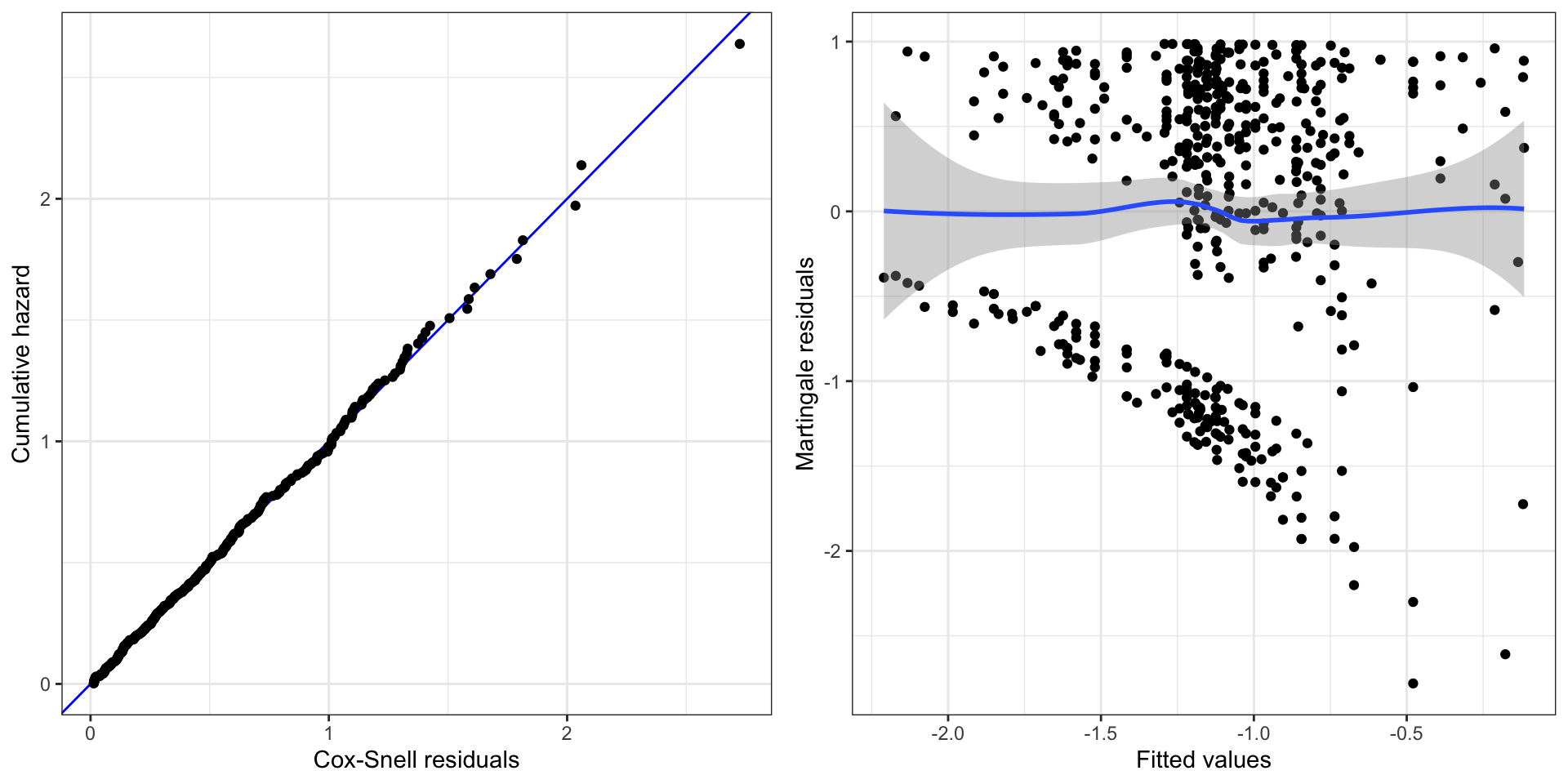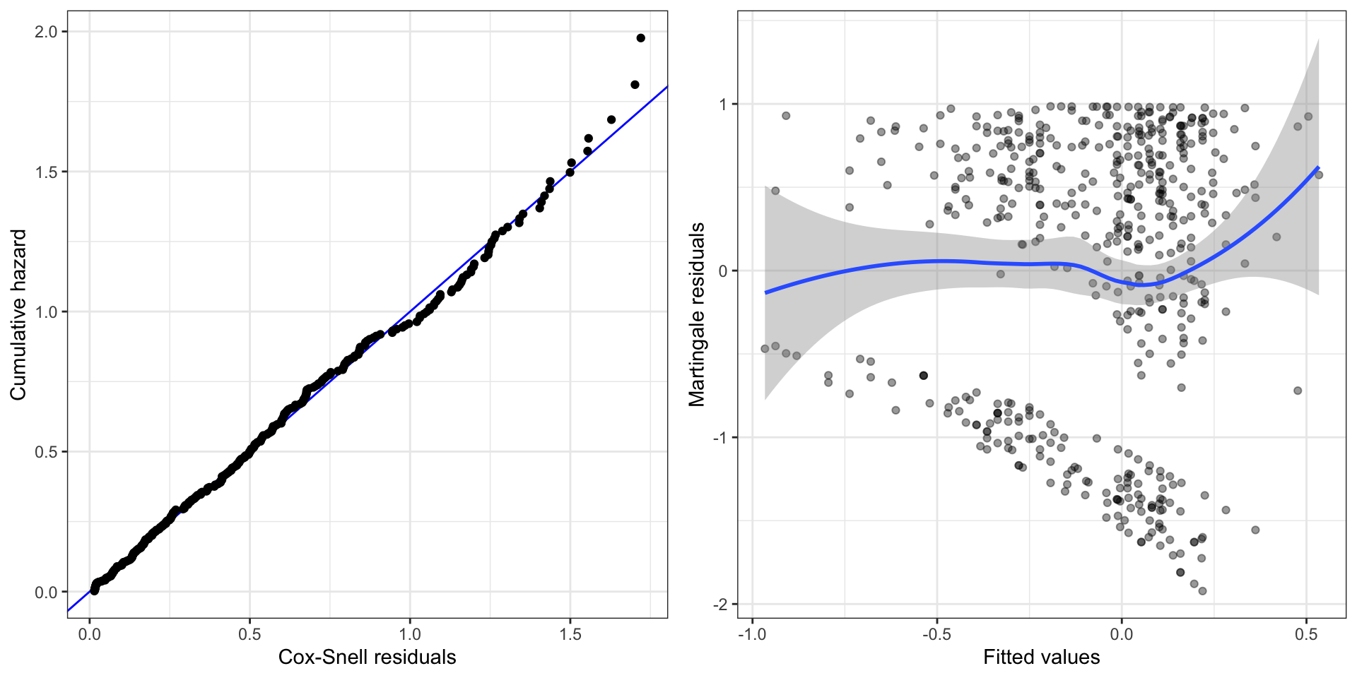Assume that \(\hat{w}_i\) is the estimate of the \(i\)-th weight and that \(\hat{\Lambda}_0\) is the estimate of the baseline. With \(\hat{\Lambda}_i = \hat{w}_i \hat{\Lambda}_0(T_i)\) the fitted cumulative hazard function for the \(i\)-th individual evaluated in \(T_i\), \[ \hat{r}_i = \delta_i - \hat{\Lambda}_i \] is the \(i\)-th martingale residual. Let \(\hat{d}_i\) denote the \(i\)-th deviance residual17.