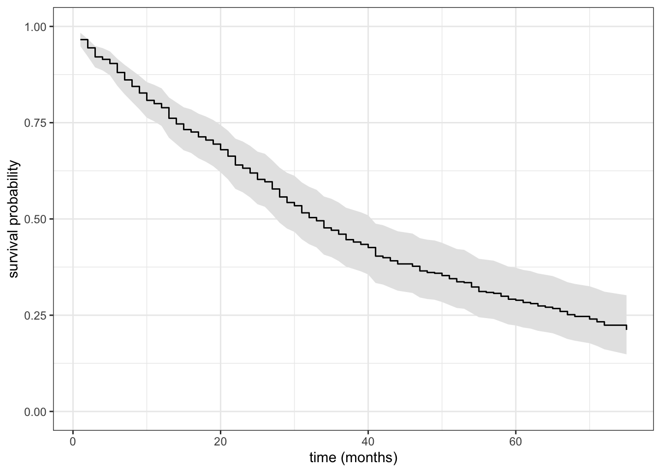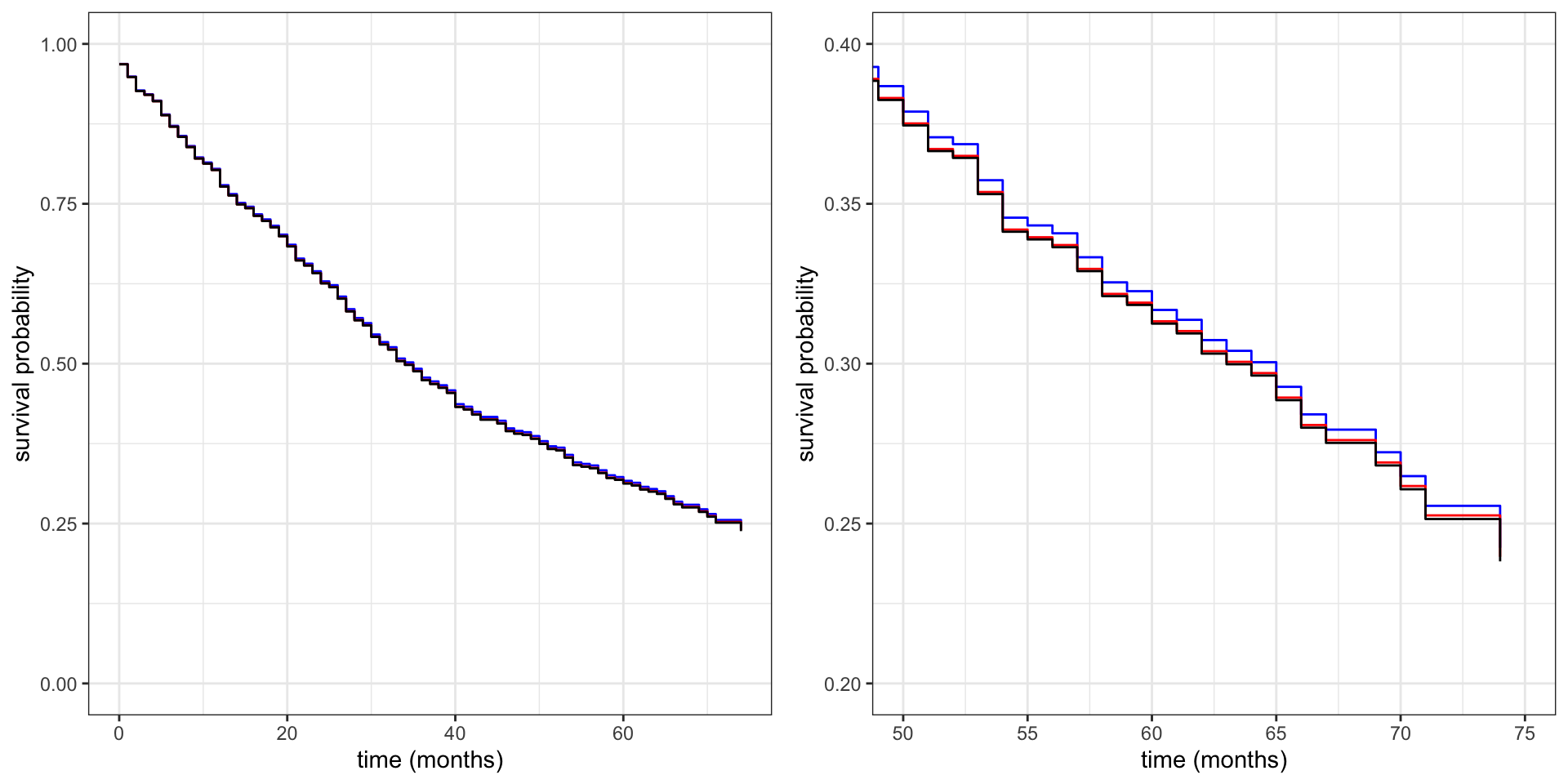 Since \(Y(T_{(i)})\) are the number of individuals at risk7 at time \(T_{(i)}\) and \(Y(T_{(i)}) - \delta_{(i)}\) are the number of individuals that die in the interval \([T_{(i)}, T_{(i+1)})\), we can regard \[ \frac{Y(T_{(i)}) - \delta_{(i)}}{Y(T_{(i)})} = 1-\frac{\delta_{(i)}}{Y(T_{(i)})} \] as an estimator of the conditional probability \(P(T^* \geq T_{(i+1)} \mid T^* \geq T_{(i-1)})\). This gives the Kaplan-Meier estimator for \(t \in [T_{(k)}, T_{(k+1)})\) \[ \hat{S}(t) = \left(1-\frac{\delta_{(k)}}{Y(T_{(k)})}\right) \left(1-\frac{\delta_{(2)}}{Y(T_{(2)})}\right) \ldots \left(1-\frac{\delta_{(1)}}{Y(T_{(1)})}\right). \]