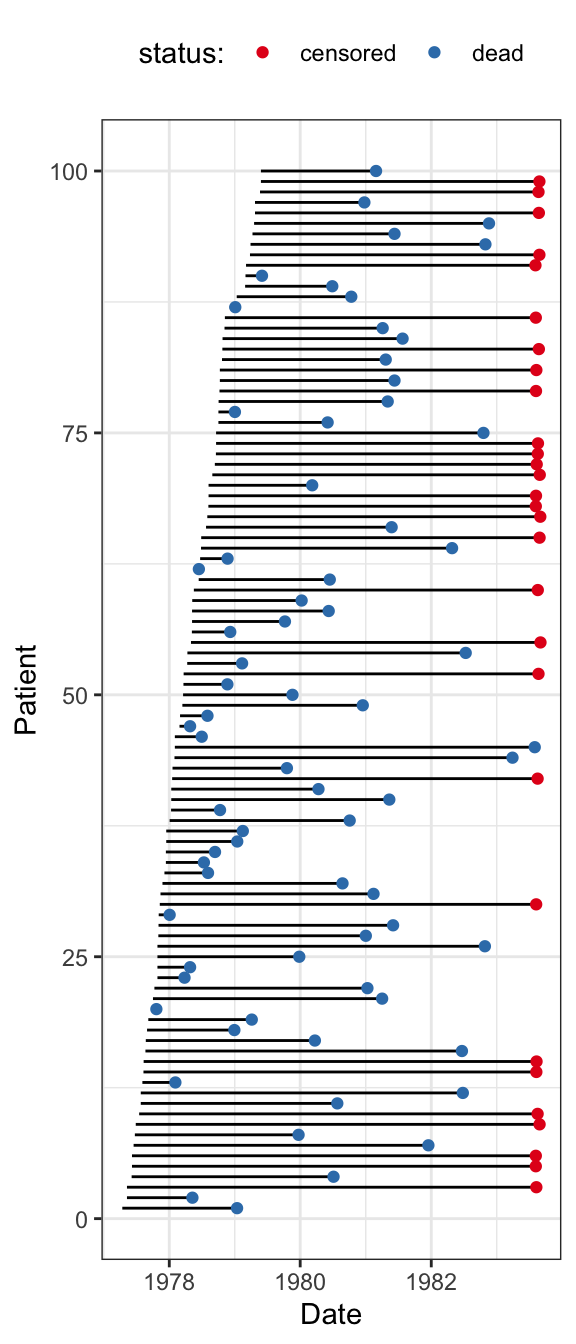 Figure 11.1 illustrates the data for the first 100 patients that enter the study. The figure shows their entry date (baseline), their survival time from that date and the status indicator when follow-up ends, indicating if they are dead or if the survival time is censored.