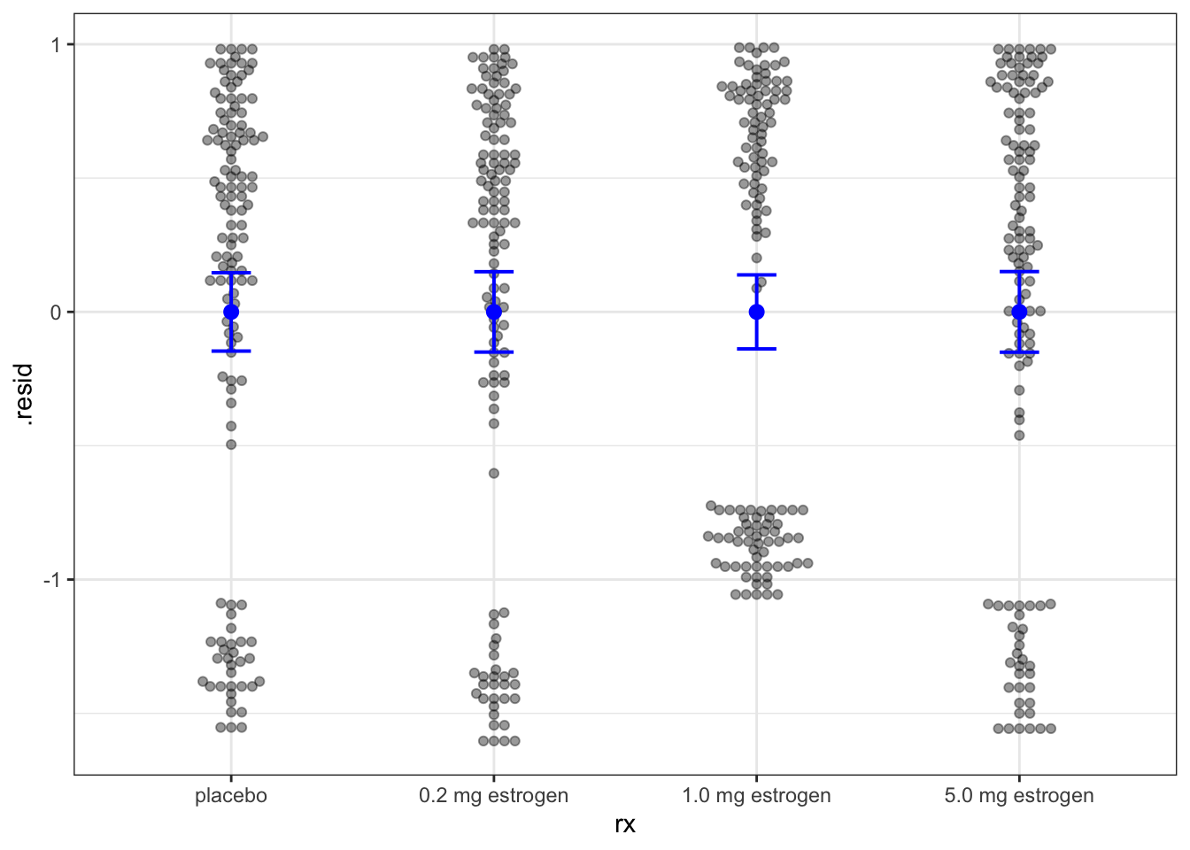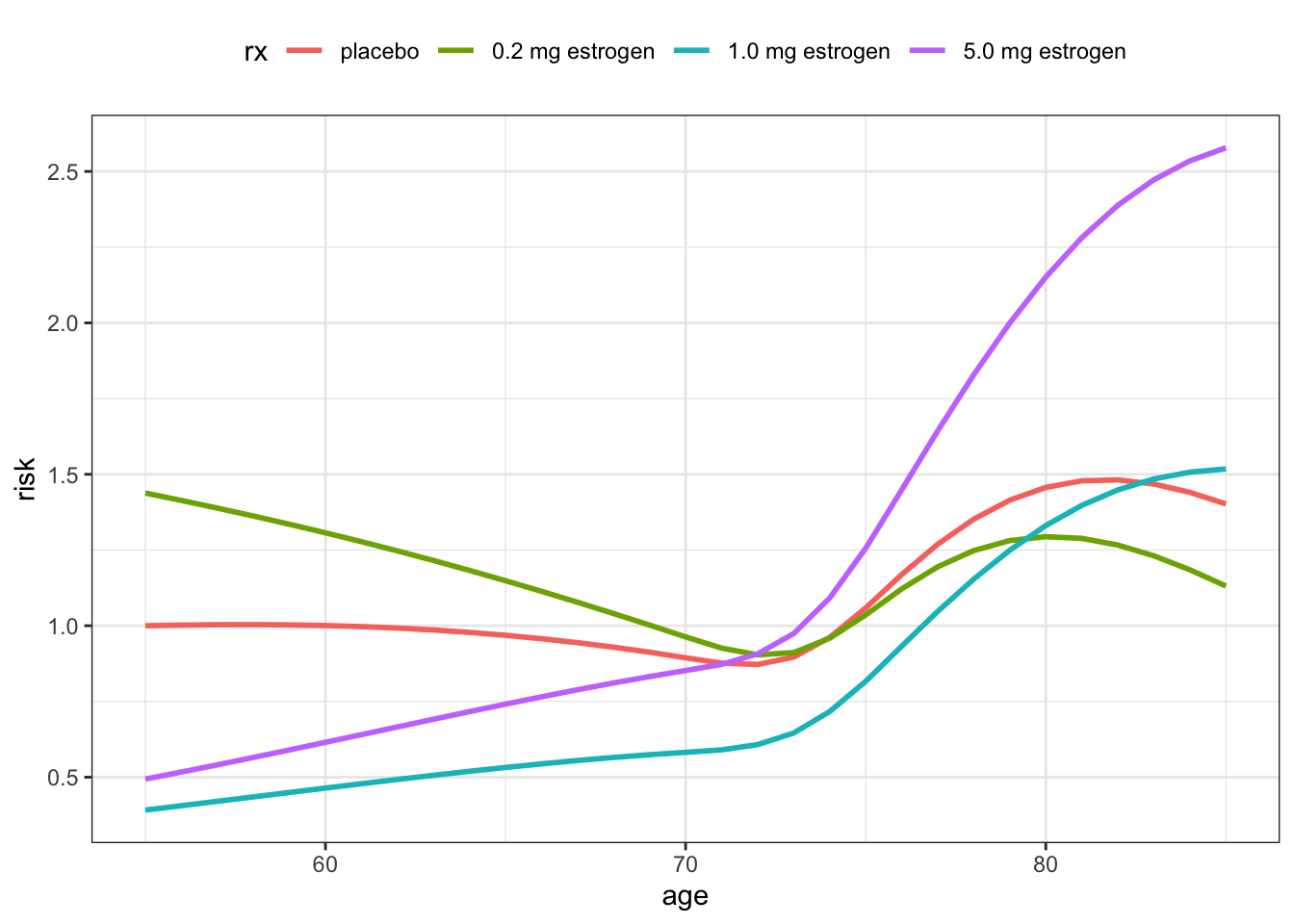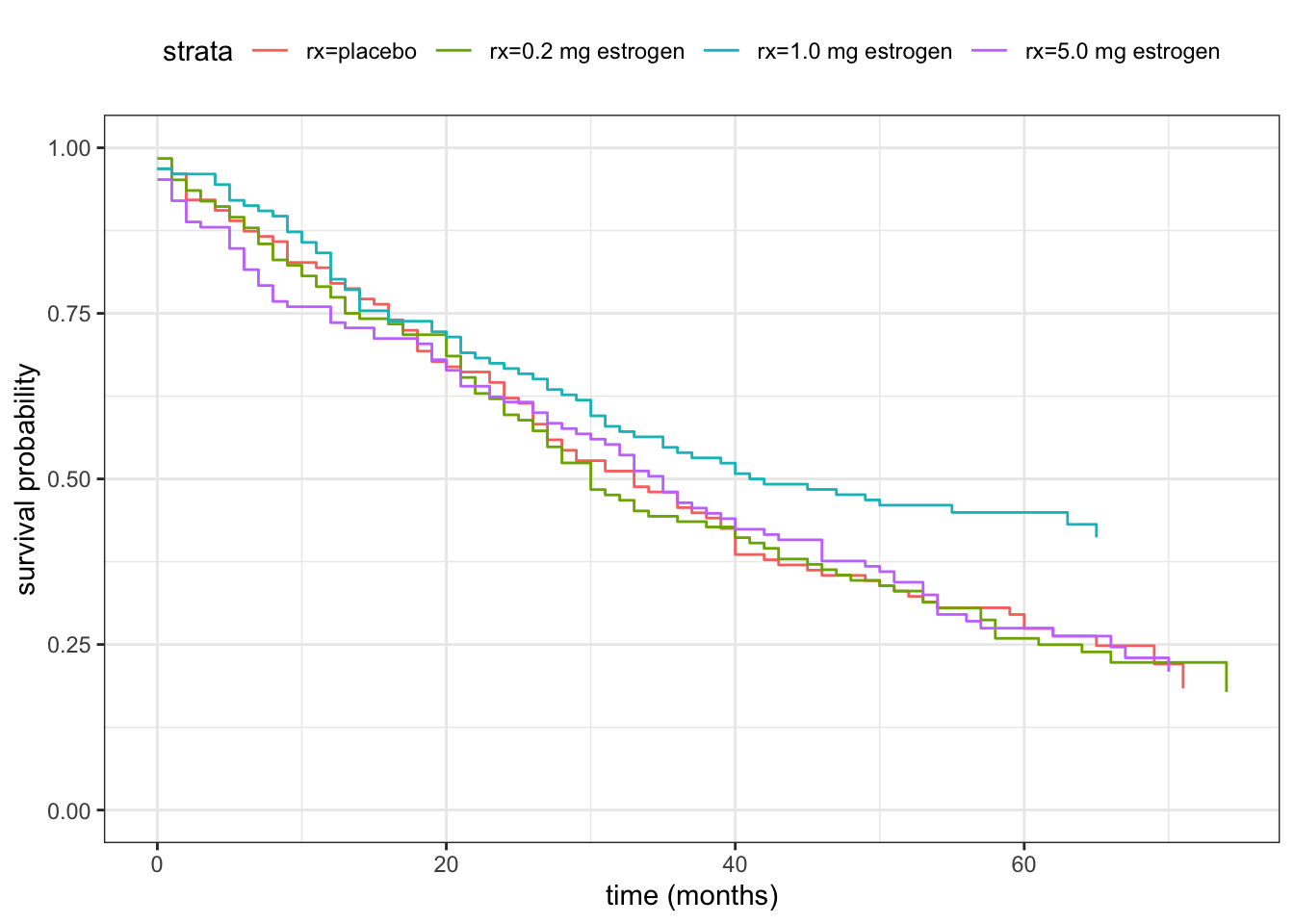. The data is from a randomized clinical trial on prostate cancer patients with four different treatments (one placebo and three different dosages of estrogen). There are 502 patients in the trial, and we will in this chapter focus on four of the variables.