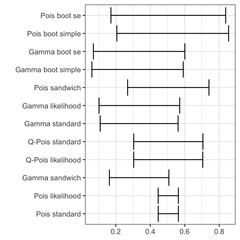 - The nonparametric bootstrap intervals are generally the widest intervals. Using the gamma model standard errors or the robust sandwich estimator for the Poisson model is a huge improvement over the Poison model based standard errors, but the nonparametric bootstrap suggests even wider intervals.