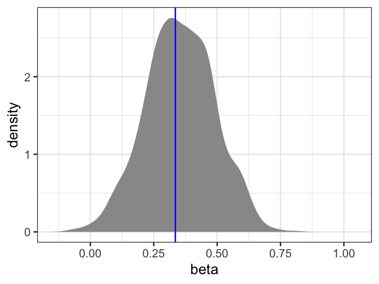 A standard confidence interval can be computed based on the nonparametric bootstrap estimate of the standard error, see Table 13.4. Alternatively, we can compute a confidence interval based on the simple combinant statistic \[ R(\hat{\beta}_{\mathrm{ad1}}, \beta_{\mathrm{ad1}}) = \hat{\beta}_{\mathrm{ad1}} - \beta_{\mathrm{ad1}}. \] Its distribution is approximated by the bootstrap distribution of \[ R(\hat{\beta}_{\mathrm{ad1}}^*, \hat{\beta}_{\mathrm{ad1}}) = \hat{\beta}_{\mathrm{ad1}}^* - \hat{\beta}_{\mathrm{ad1}}, \] where \(\hat{\beta}_{\mathrm{ad1}}^*\) denotes the parameter estimate for the nonparametrically bootstrapped sample. With \(\hat{w}_{\alpha}\) and \(\hat{z}_{\alpha}\) denoting the \(\alpha / 2\) and \(1 - \alpha / 2\) quantiles of the empirical bootstrap distribution of \(\hat{\beta}_{\mathrm{ad1}}^* - \hat{\beta}_{\mathrm{ad1}}\), we compute the confidence interval as \[ \{\beta \in \mathbb{R} \mid \hat{\beta}_{\mathrm{ad1}} - \beta \in (\hat{w}_{\alpha}, \hat{z}_{\alpha}) \} = (\hat{\beta}_{\mathrm{ad1}} - \hat{z}_{\alpha}, \hat{\beta}_{\mathrm{ad1}} - \hat{w}_{\alpha}). \] Note how it is the smaller quantile that determines the upper limit of the interval and the larger quantile that determines the lower limit. This results in the following confidence interval with nominal coverage 95%.