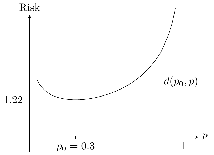 Letting \(\rho_0\) denote the distribution of \(Y\), the risk3 of \(\rho\) is the expectation of the loss, \[ \mathrm{Risk}(\rho) = E \big( \mathrm{Loss}(Y, \rho) \big) = \int \mathrm{Loss}(y, \rho) \rho_0(\mathrm{d}y), \] provided that the expectation exists. The larger the value of the loss is, the greater is the discordance, but there is no convention on the scale. Low risk is better than high risk, but the risk of a model can only be interpreted relative to the risk of other models.