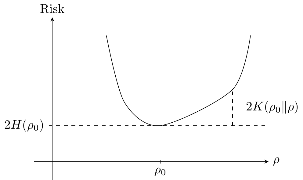 From the definition of the Kullback-Leibler divergence we have that for the negative log-likelihood loss, \[ \mathrm{Risk}(\rho) = 2H(\rho_0, \rho) = 2K(\rho_0\|\rho) + 2H(\rho_0). \tag{9.6}\] This decomposition has a similar interpretation as the bias-variance decomposition for the mean squared error. The entropy term corresponds to the variance term while the Kullback-Leibler term corresponds to the squared bias term. Minimizing the risk is equivalent to minimizing the Kullback-Leibler divergence.