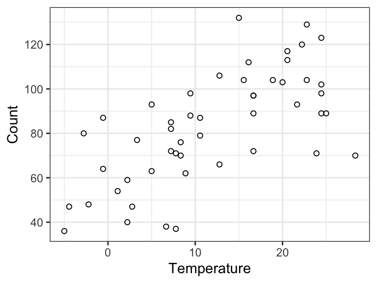 <- ggplot(bike, aes(Temperature, Count)) + geom_point(pch = 1)