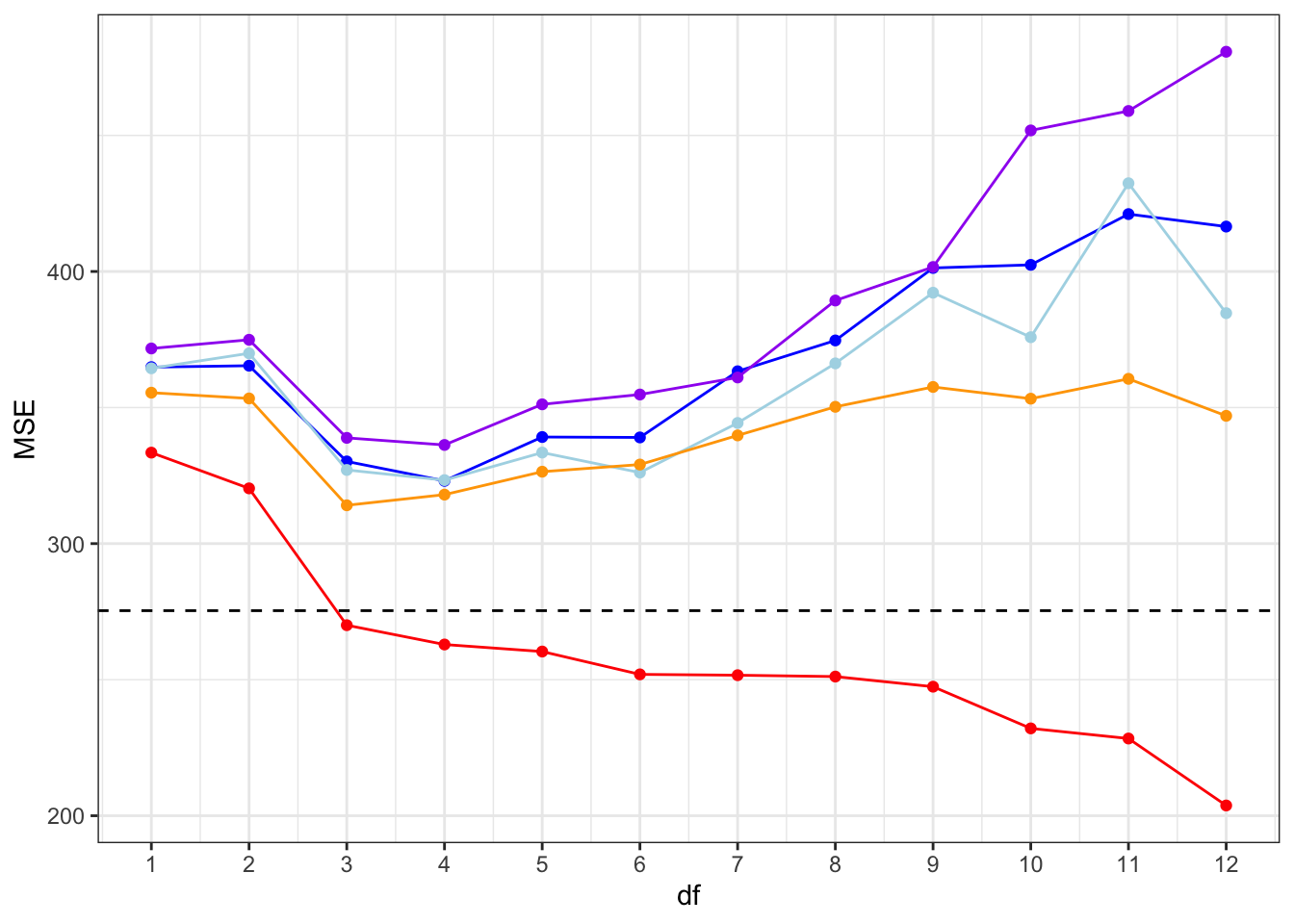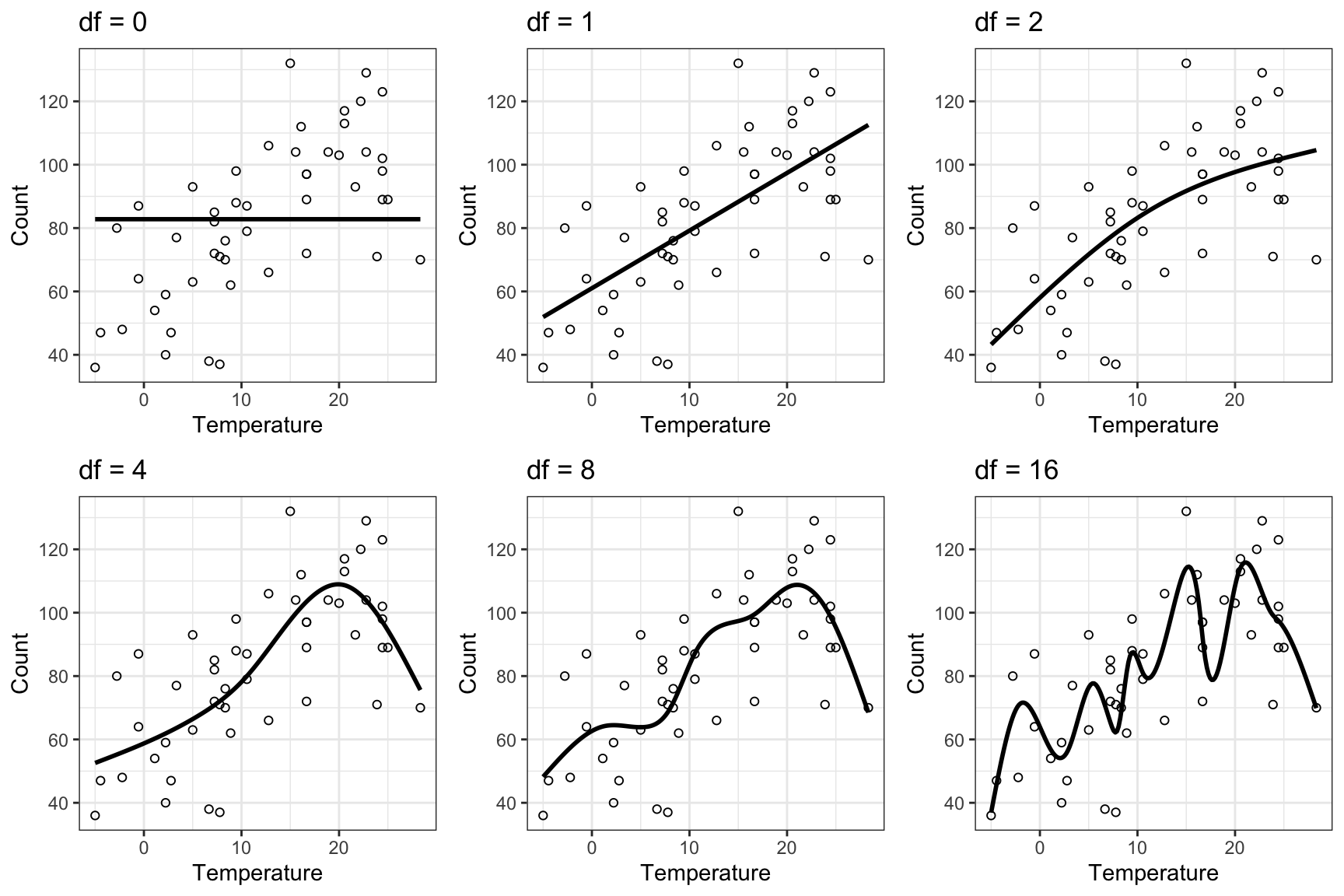 \] where the \(h_d\)-s are spline basis functions. The number \(\mathrm{df}\) specifies the number of basis functions and thus the complexity of the model. The dimension of the corresponding linear model will be \(\mathrm{df} + 1\), since the model also includes an intercept. The code below fits six models for \(\mathrm{df}\) ranging from \(0\) to \(16\).