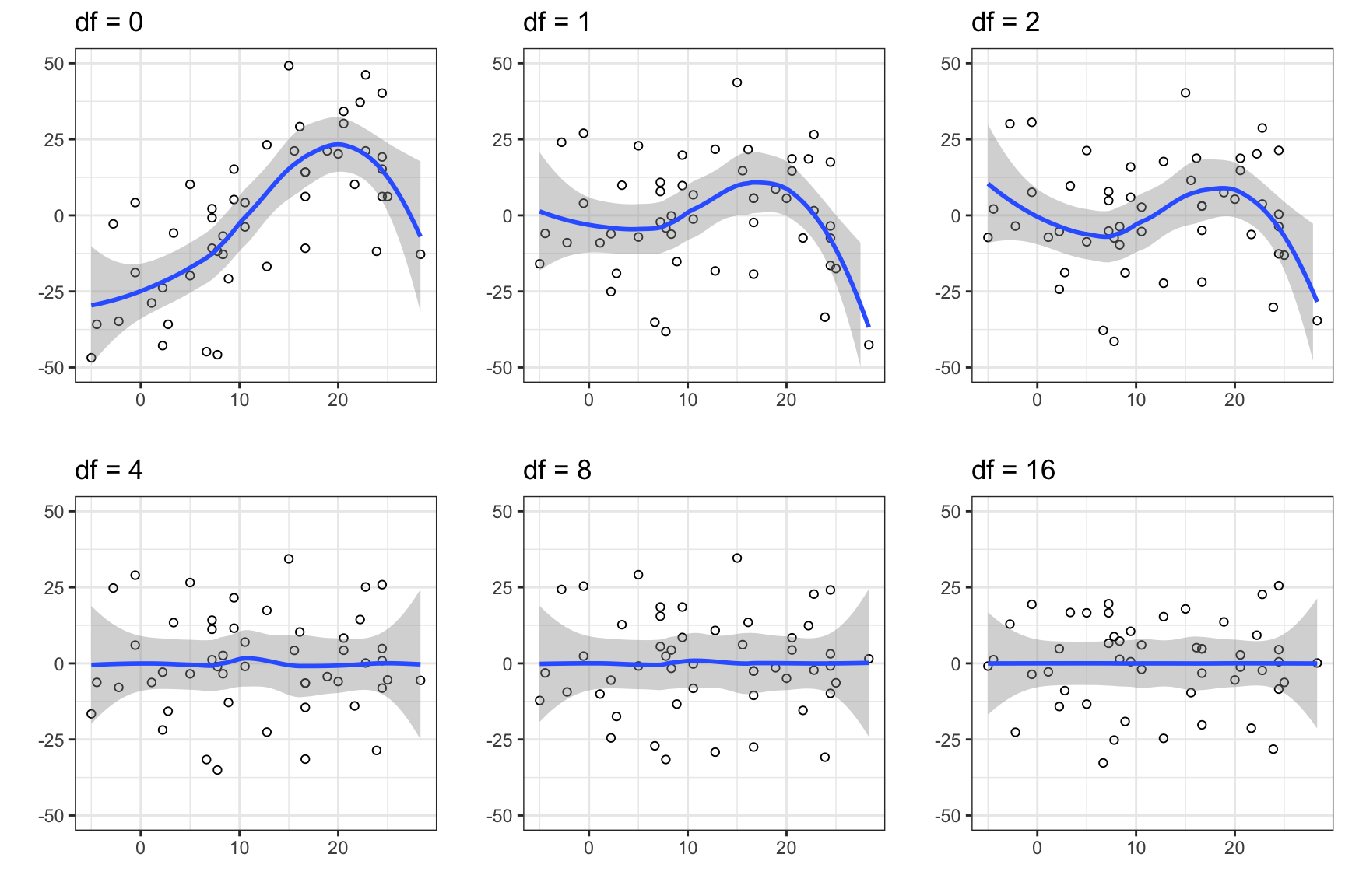Figure 9.3 shows the residual plots for the six models. We see that the three models with \(\mathrm{df} \leq 2\) are misspecified. This is particularly pronounced for the intercept-only model (\(\mathrm{df} = 0\)). From the residual plots alone, the remaining three models appear to fit the data well.