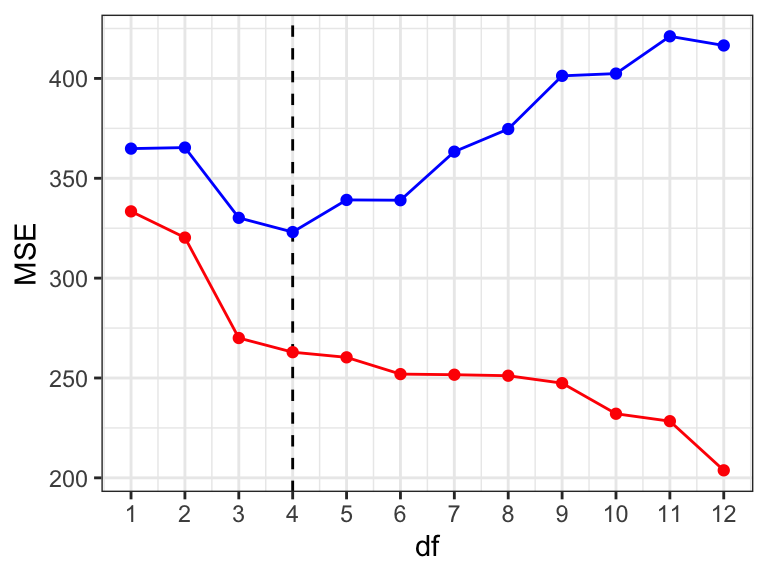 Table 9.2 shows the adjusted \(R^2\) together with the mean squared error on the data used to fit the models, which is computed as \[ \frac{1}{n} \sum_{i=1}^n (Y_i - \hat{m}(X_i))^2, \tag{9.1}\] where \(\hat{m} = \hat{\beta}_0 + \sum_{d=1}^{\mathrm{df}} \hat{\beta}_d h_d\). We note that the MSE is monotonely decreasing as a function of the complexity of the model, that is, as a function of \(\mathrm{df}\). The adjusted \(R^2\) increases until \(\mathrm{df} = 4\), and then it appears to settle just above \(0.5\) – suggesting that the models can explain around 50% of the variation in the data.