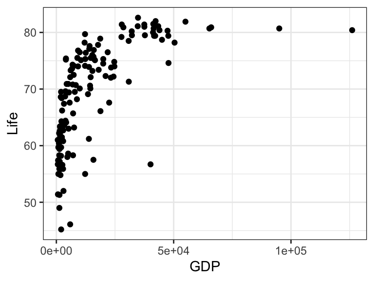 Exercise 9.1 This exercise is based on the gapminder dataset included in the RwR package. It contains the gross domestic product (GDP) per capita and the average life expectancy at birth (Life) for 139 countries. Figure 9.11 shows a scatter plot of the data.