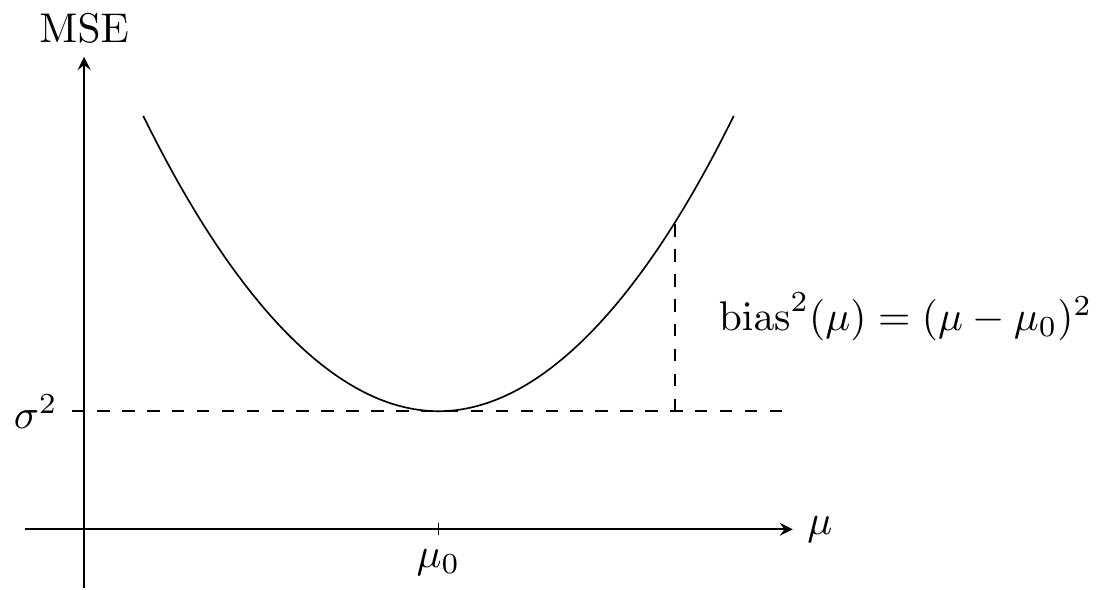 The size of the squared bias can best be interpreted relative to the variance \(\sigma^2\), and the unitless quantity \[\frac{\mathrm{bias}^2(\mu)}{\sigma^2}\] is therefore a useful quantification of the predictive strength of \(\mu\).